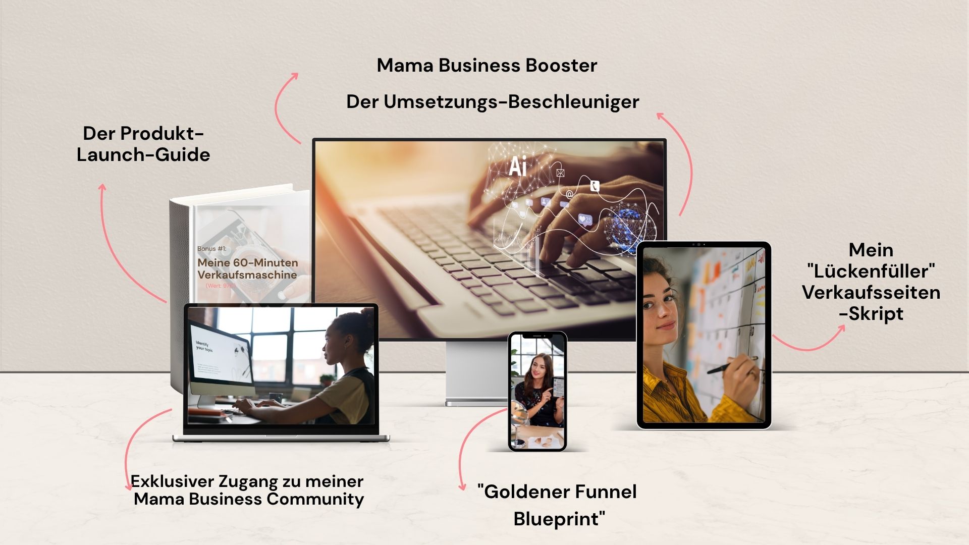 Schritt 3: Erhalte sofortigen Zugang zum "Mama Business Booster" und allen genannten Boni. Beginne schon in wenigen Minuten mit dem Aufbau deines Produkts.